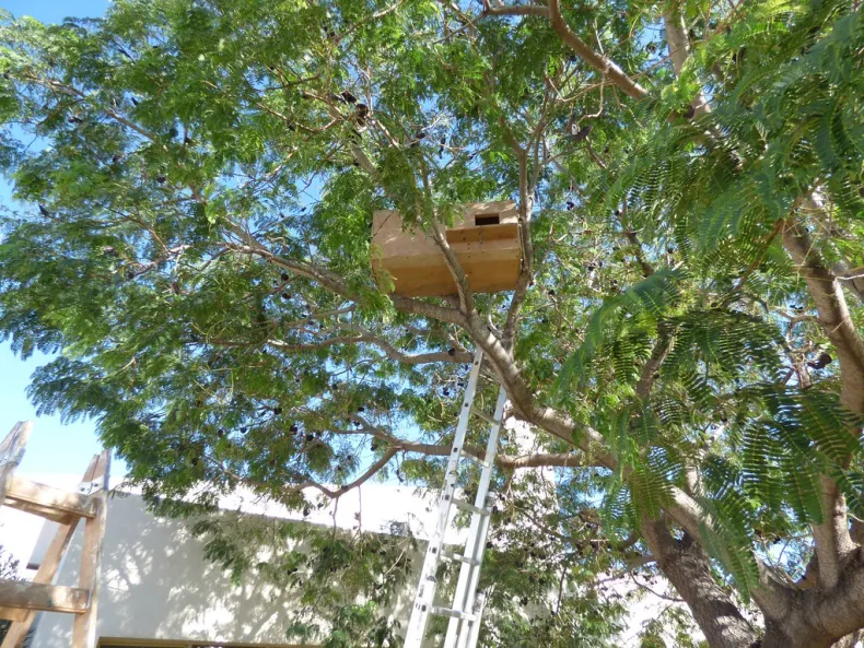 Tras una inspección del predio, se seleccionó un árbol adecuado dentro del jardín de la misma institución para instalar una caja nido. La estructura fue construida por operadores del Parque de Tecnologías Ambientales (PTA), utilizando materiales reciclados.