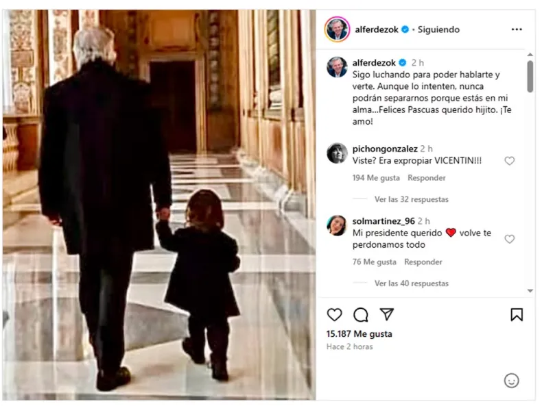 "Sigo luchando para poder hablarte y verte. Aunque lo intenten, nunca podrán separarnos porque estás en mi alma… Felices Pascuas querido hijito. ¡Te amo!", escribió este domingo pasado el mediodía, junto a una foto en la que se lo ve caminando de la mano con su hijo en un edificio del Vaticano.