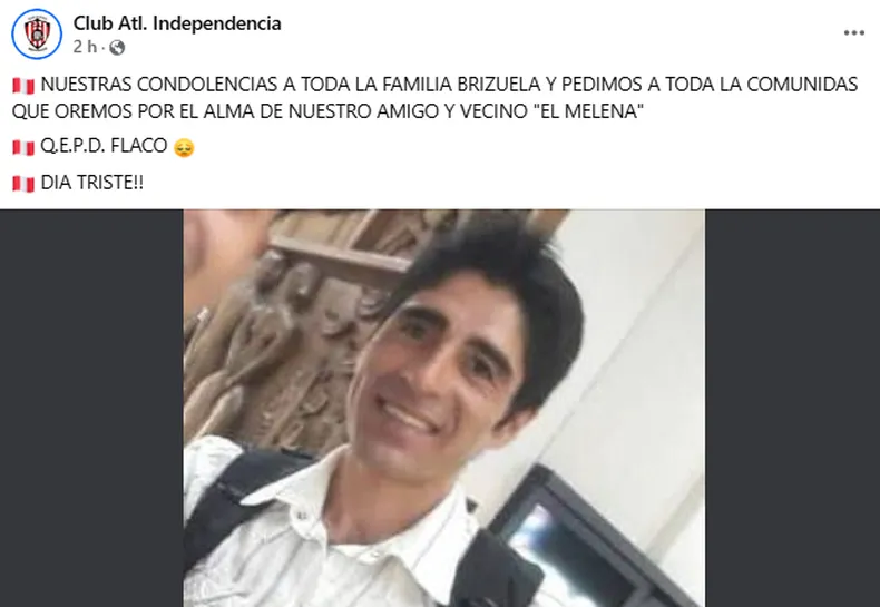 La noticia causó un profundo dolor entre quienes lo conocían. En redes sociales, amigos y vecinos no tardaron en expresar su tristeza y enviar mensajes de apoyo a la familia. Uno de los homenajes más sentidos fue el del Club Atlético Independencia, que compartió una publicación para despedirlo: "Nuestras condolencias a toda la familia Brizuela y pedimos a toda la comunidad que oremos por el alma de nuestro amigo y vecino, "El Melena". Que en paz descanse. Mucha fuerza a la familia".