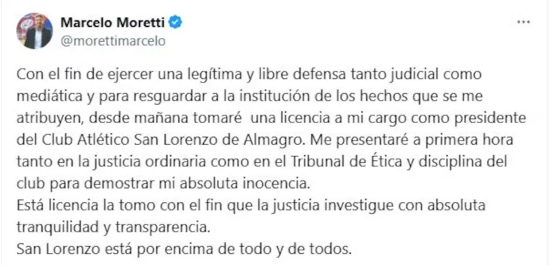 Marcelo Moretti, presidente de San Lorenzo, solicitó una licencia en sus funciones luego de que se hiciera pública una cámara oculta en la que se lo ve involucrado en un supuesto pedido de coima vinculado a la contratación de un jugador para las divisiones juveniles del club.