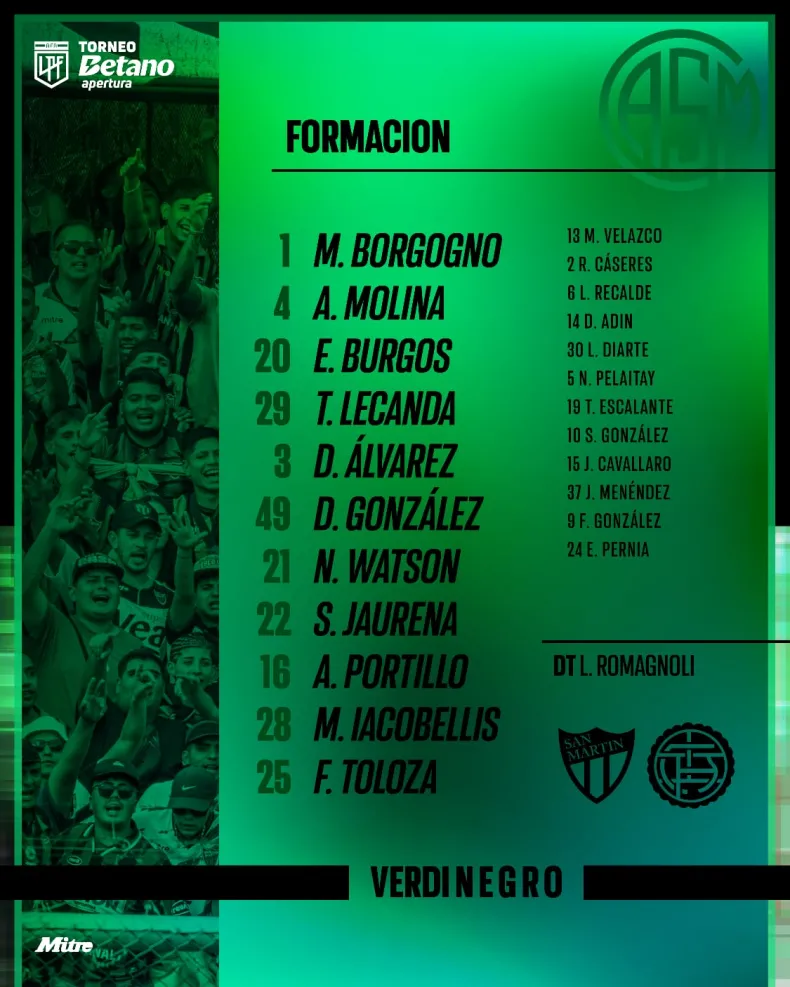 El técnico Leandro Romagnoli realiza dos variantes en el equipo titular. El regreso de Diego González en reemplazo de Tijanovich y de Marco Iacobellis por Cavallaro son las variantes que introduce el entrenador.