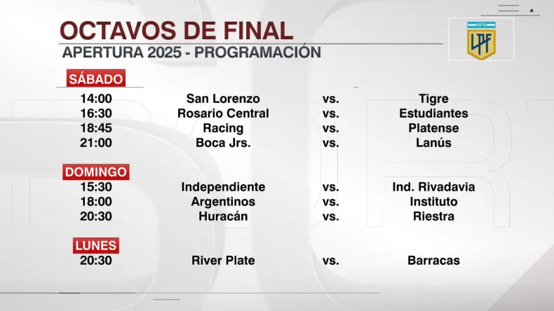 El Torneo Apertura 2025 de la Liga Profesional ya tiene definidos a los dieciséis clasificados a los octavos de final: Estudiantes, en la zona A, e Instituto, en la zona B, fueron los últimos en clasificar, mientras que el empate de Boca ante Tigre y la victoria de River sobre Vélez terminaron de definir los cruces, que se jugarán en estos días y horarios: