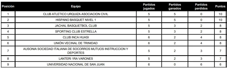 Urquiza dejó su racha demoledora y apenas alcanzó los 62 puntos pero le sirvió para ganarle como visitante a Jáchal BC por 5 puntos. Emanuel Cabañas fue el goleador del partido aportando 26 puntos para Urquiza, 11 rebotes y 2 asistencias. De los 57 puntos convertidos por los jachalleros Ismael Sarruf aportó 26.