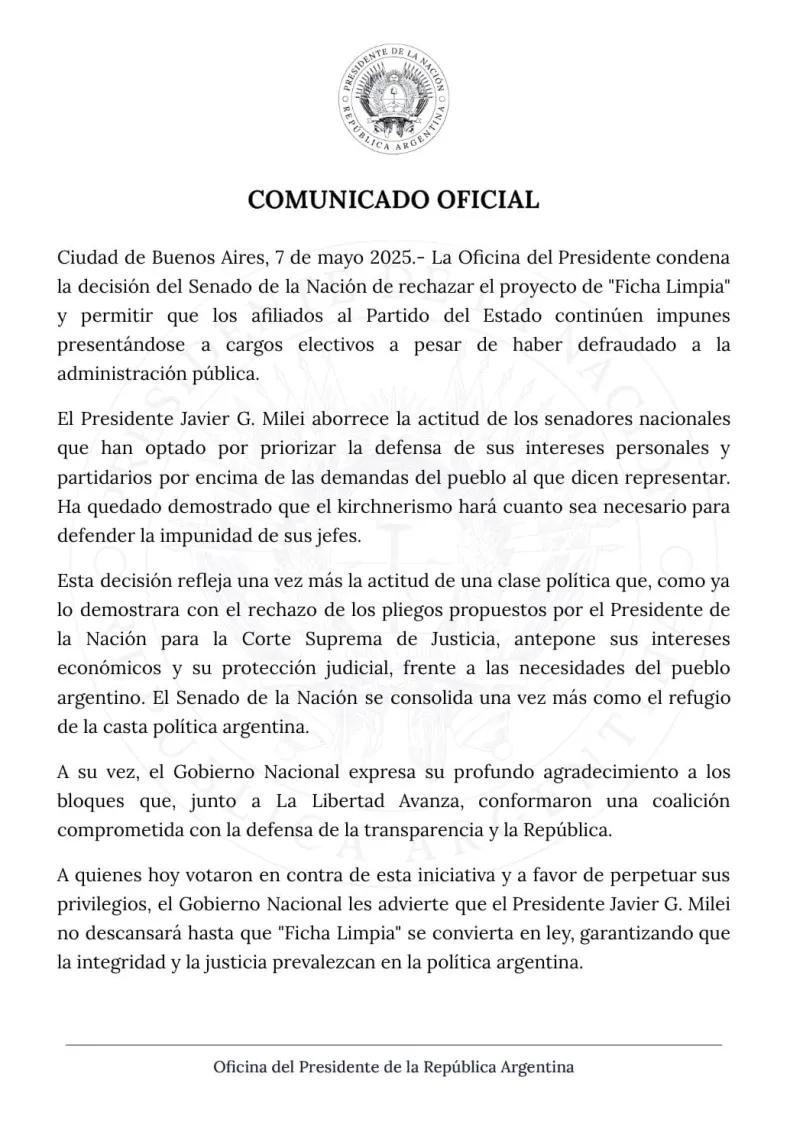 Luego del rechazo del Senado al proyecto de Ley de Ficha Limpia, la Oficina del Presidente difundió un comunicado oficial con fuertes críticas al Congreso y al kirchnerismo. En el texto, el Gobierno expresó su "condena " a la decisión parlamentaria y acusó a la oposición de actuar en defensa de intereses personales y partidarios, en lugar de atender a las demandas del pueblo.