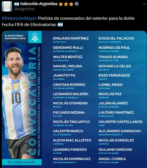 Un punto importante a resaltar es que Argentina ya se clasificó al Mundial de México, Estados Unidos y Canadá de 2026, por lo que Scaloni también podría optar por citar a jugadores que no tuvieron rodaje durante el último tiempo o que no fueron llamados en las últimas fechas FIFA.