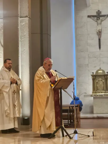 La celebración estará presidida por el obispo auxiliar de la provincia, Gustavo Larrazábal, quien recibió al mandatario provincial en las escalinatas de la Catedral.