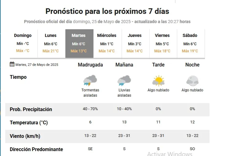 Este lunes la temperatura no subirá mas alla de los 21º con la presencia de nubes en toda la jornada. Pero a partir de la noche con la sabido descenso se acentuará con la llegada de viento sur que hará la mañana del martes con presencia de nubes cargadas pueda generar algunas lluvias aisladas.
