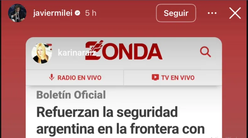 El presidente de la Nación, Javier Milei, compartió este lunes por la tarde en sus historias de Instagram una publicación de Zonda Diario. Como es habitual, el mandatario utiliza sus redes sociales para difundir información que considera relevante o con la que se siente identificado.