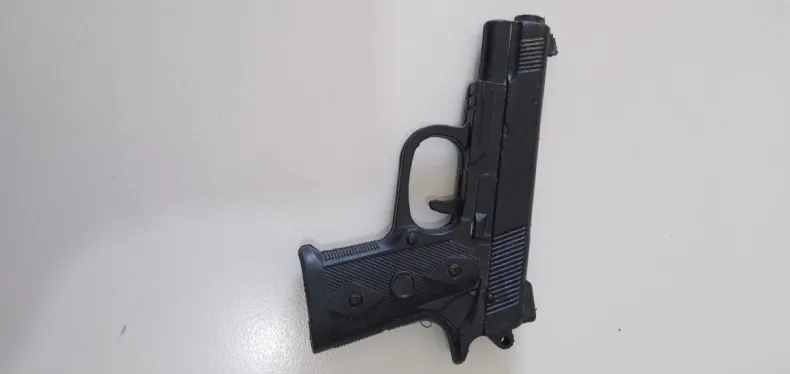Si bien, el sujeto, no estaba al momento de allanar la vivienda, sí se encontró el automóvil marca Ford Escort, de color verde, reconocido por la damnificada, pero también se le encontró una réplica, de arma de fuego tipo pistola, de plástico.