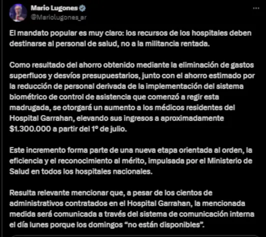 Lugones, a través de un tweet, afirmó que "el mandato popular es muy claro: los recursos de los hospitales deben destinarse al personal de salud, no a la militancia rentada". El ministro detalló que el aumento a los residentes se debe al "ahorro obtenido mediante la eliminación de gastos superfluos y desvíos presupuestarios, junto con el ahorro estimado por la reducción de personal derivada de la implementación del sistema biométrico de control de asistencia que comenzó a regir esta madrugada".
