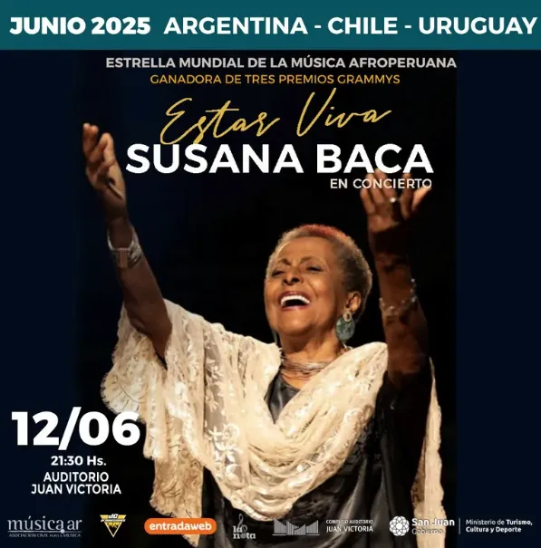 El concierto de la reconocida artista internacional Susana Baca, previsto para el jueves 12 de junio en el Auditorio Juan Victoria de San Juan, ha sido cancelado. La noticia fue comunicada a través de un comunicado oficial de la Asociación Civil por la Música, con fecha del 1 de junio de 2025.