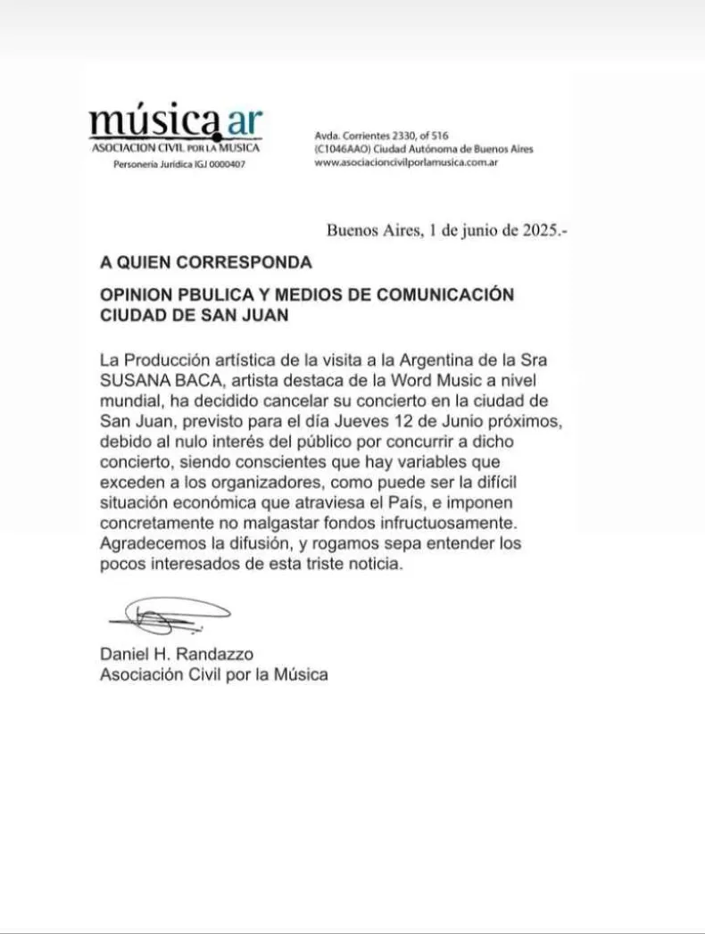La aclamada artista de la "Word Music" Susana Baca no se presentará en San Juan el próximo 12 de junio. La Asociación Civil por la Música, organizadora del evento, informó que la cancelación se debe al "nulo interés del público", reflejado en la baja venta de entradas, a pesar de reconocer la difícil situación económica del país.