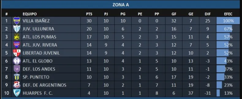 Villa ibañez esta implacable en el fútbol de ascenso local y luego de 10 fechas se mantiene invicto con el puntaje perfecto en la zona A y le sacó 10 puntos de ventaja a su mas inmediato perseguidor que es Juventud Ullunera.