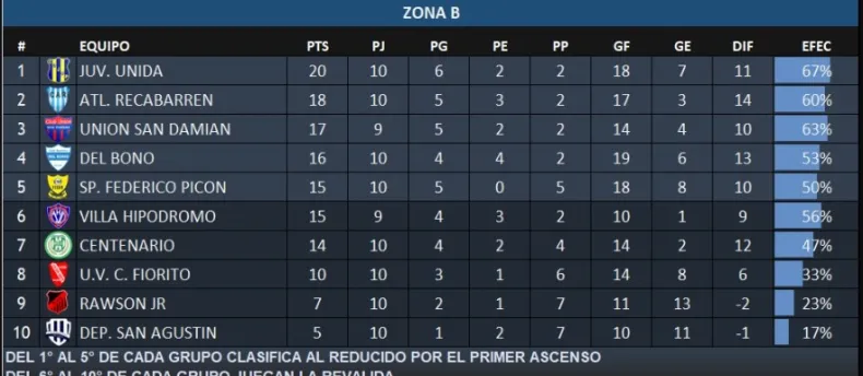 En la zona B, el puntero es Juventud Unida que viene de empatar 1 a 1 con su escolta Recabarren de Zonda. En este grupo la paridad está marcada y hay cuatro equipos peleando por el primer lugar
