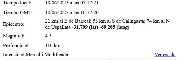 Un movimiento sísmico de magnitud 4.5° en la escala de Richter sacudió la provincia de San Juan en las primeras horas de este martes, según informó el Instituto Nacional de Prevención Sísmica (INPRES). El evento ocurrió a las 7:17 de este martes 10 de junio.