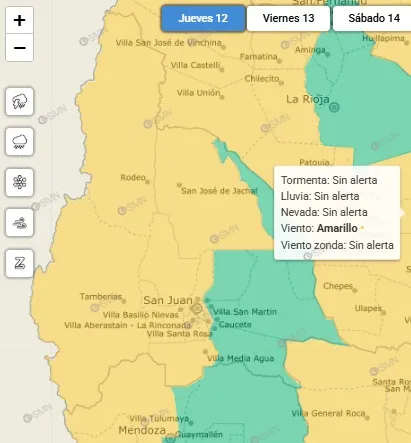 Este jueves, el Servicio Meteorológico Nacional (SMN) amplió la alerta amarilla por viento Zonda que afecta a gran parte del territorio sanjuanino. El fenómeno ya comenzó a sentirse en varias zonas cordilleranas y se espera que continúe durante el resto de la jornada.