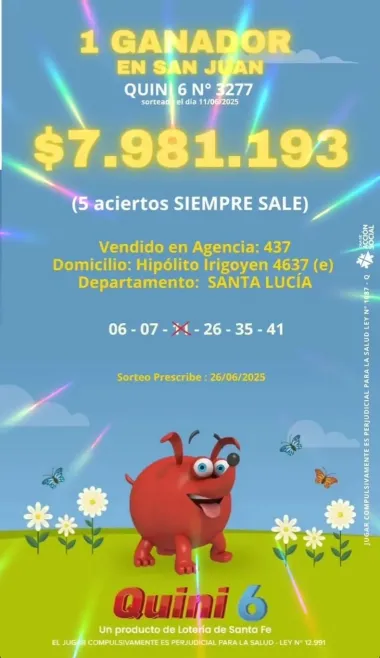 La suerte volvió a sonreírle a San Juan. En el último sorteo del Quini 6, realizado este miércoles, un apostador sanjuanino ganó casi 8 millones de pesos tras acertar los números ganadores en la modalidad Siempre Sale.