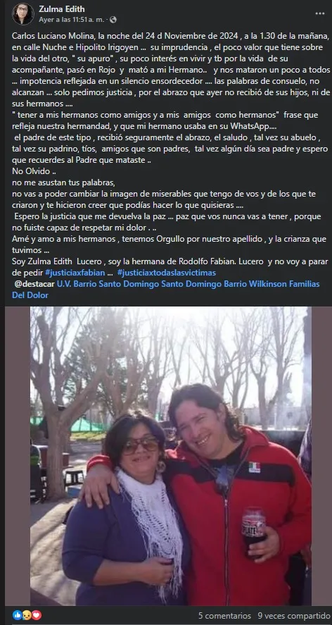 La hermana de la víctima expresó en su publicación la profunda impotencia y el dolor que siente la familia. "Su imprudencia, el poco valor que tiene sobre la vida del otro, "su apuro", su poco interés en vivir y también por la vida de su acompañante, pasó en Rojo y mató a mi Hermano... y nos mataron un poco a todos", escribió.