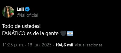 En redes, cerró la noche agradeciendo a sus seguidores a través de X: "Todo de ustedes! FANÁTICO es de la gente."