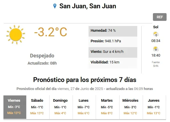 El amanecer sorprendió a los sanjuaninos con una mínima de -3.2°C y una sensación térmica aún más baja: -5°C, según el Servicio Meteorológico Nacional. A las 8 de la mañana, el cielo estaba completamente despejado, lo que permitió el descenso térmico extremo.