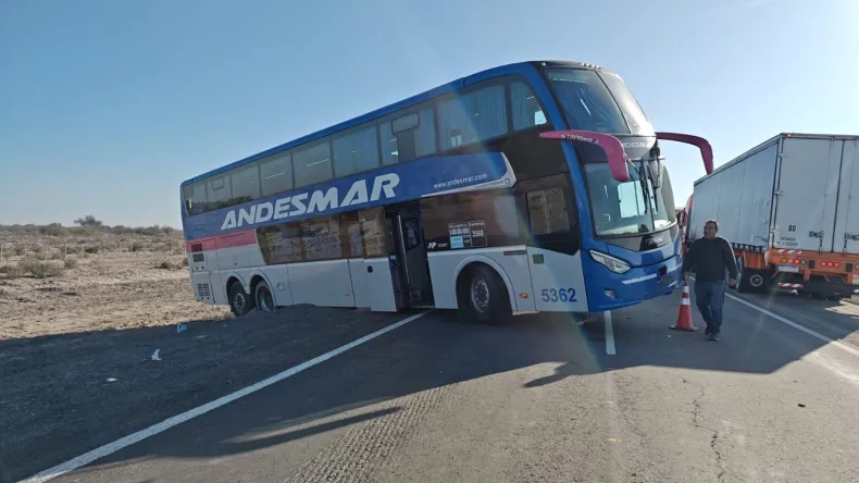 Si bien, el colectivo no iba con su pasaje completo, los pasajeros que viajaban en un colectivo de larga distancia de la empresa Andesmar, se llevaron un gran susto y minutos de terror cuando, la unidad de un momento a otro, quedó cruzado entre la ruta y la banquina, cuando transitaba por ruta Nacional 20, a la altura de calle Divisoria en el departamento 25 de Mayo.