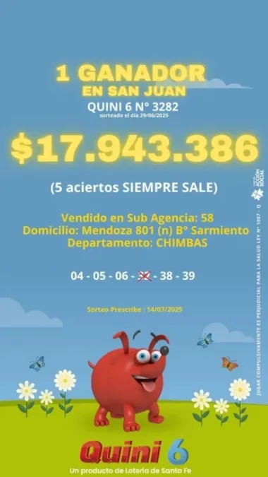 El afortunado jugó en una subagencia de Chimbas y acertó cinco números en la modalidad "Siempre Sale" del Quini 6, llevándose casi 18 millones de pesos.