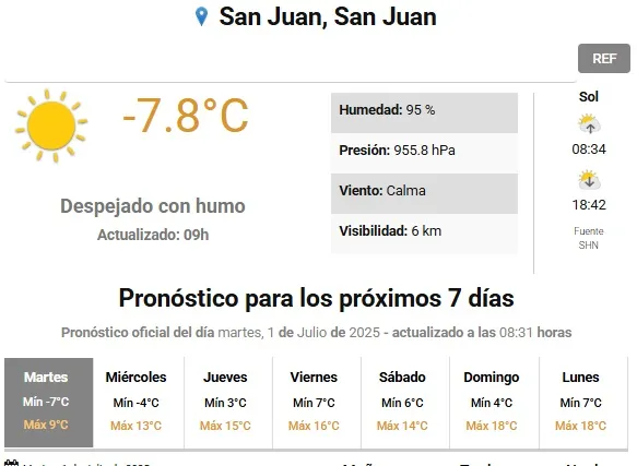 El invierno no da tregua en San Juan. Este martes 1 de julio, la provincia registró una de las mañanas más frías del año, con una temperatura de -7,8°C a las 9 horas, según datos del Servicio Meteorológico Nacional. Ayer lunes, después de la nieve del domingo, la mínima alcanzó solamente los -4.2°C.