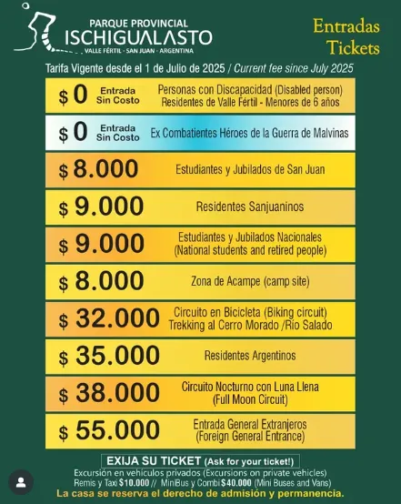Desde la administración del parque recordaron que es obligatorio solicitar el ticket de ingreso y que se reserva el derecho de admisión y permanencia. Ischigualasto, conocido mundialmente como el "Valle de la Luna", continúa siendo un punto clave del turismo provincial, y con esta actualización busca mantener su funcionamiento y calidad de atención ante el aumento de costos operativos.