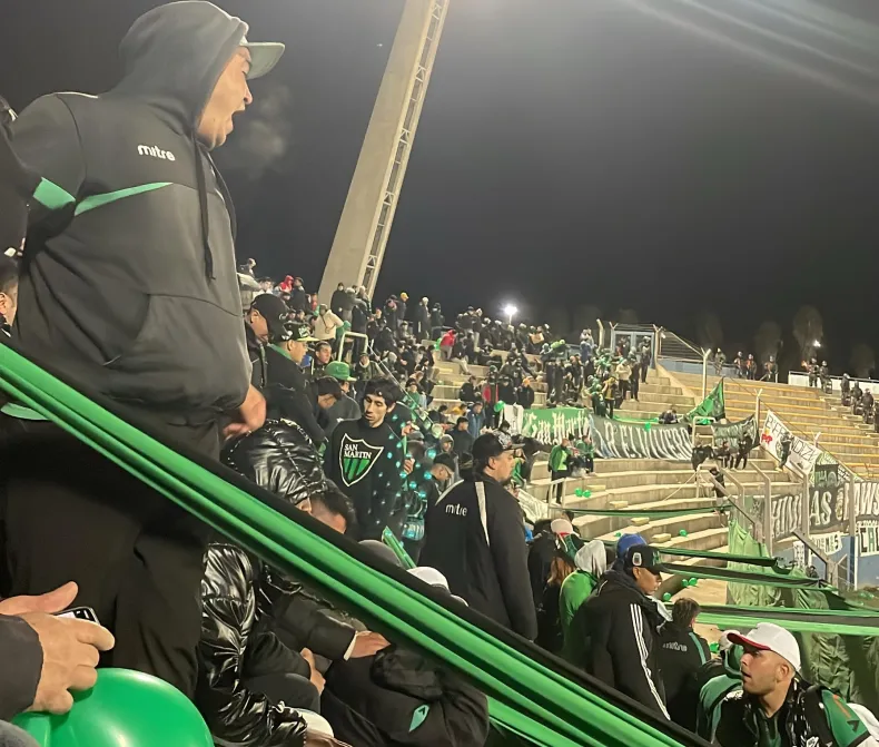 Siete colectivos con hinchas de San Martín llegaron al estadio de La Punta en San Luis para alentar al equipo. En el inicio del partido tiraron bombas de estruendo que retrasaron el comienzo.