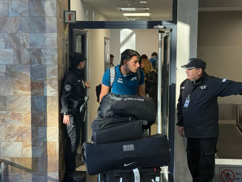 El plantel nacional aterrizó este domingo a las 17:15 en el Aeropuerto Domingo Faustino Sarmiento, donde fue recibido por fanáticos y autoridades locales.