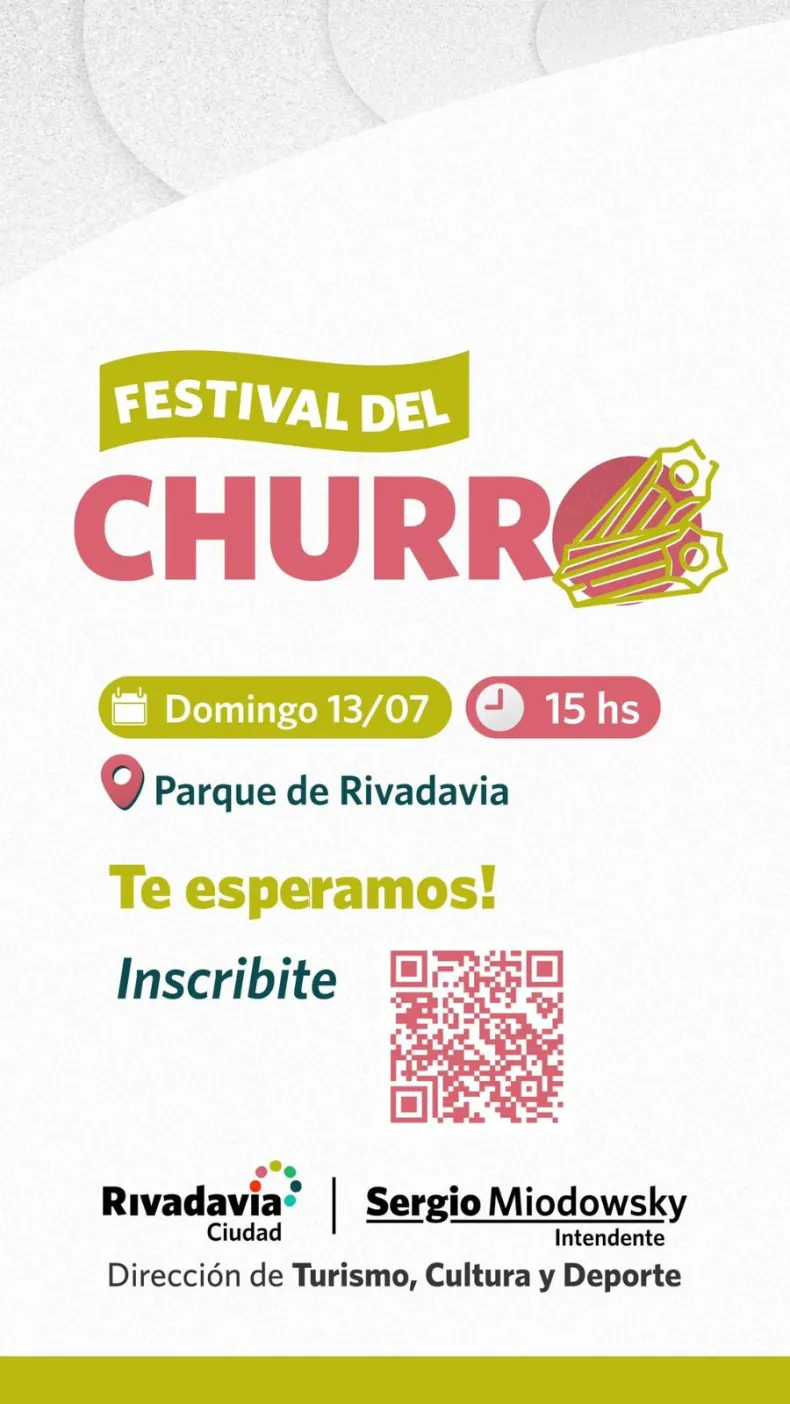 Este domingo 13 de julio, a partir de las 15 horas, el Parque de Rivadavia será escenario del primer Festival del Churro. Organizado por la Dirección de Turismo, Cultura y Deporte de la Municipalidad de Rivadavia, la propuesta combina sabor local, competencia gastronómica y música en vivo, con entrada libre y gratuita.