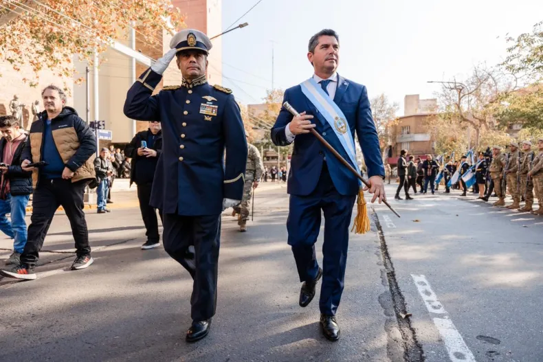 La ceremonia comenzó temprano en la Plaza 25 de Mayo, epicentro de las celebraciones patrias, con el izamiento del pabellón nacional y la entonación del Himno Nacional Argentino. El mandatario provincial estuvo acompañado por el vicegobernador Fabián Martín, legisladores, autoridades del Poder Judicial, representantes de las fuerzas armadas y de seguridad, e instituciones locales.