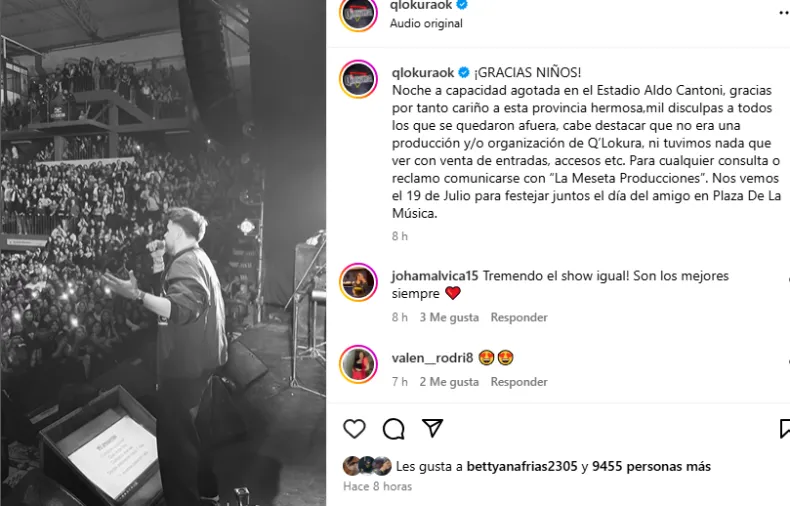 Al finalizar el espectáculo, desde las redes sociales oficiales de Q’Lokura reiteraron el mensaje: "Mil disculpas a todos los que se quedaron afuera, cabe destacar que no era una producción y/o organización de Q’Lokura, ni tuvimos nada que ver con la venta de entradas, accesos, etc. Para cualquier consulta o reclamo, comunicarse con La Meseta Producciones", indicaron en un comunicado.