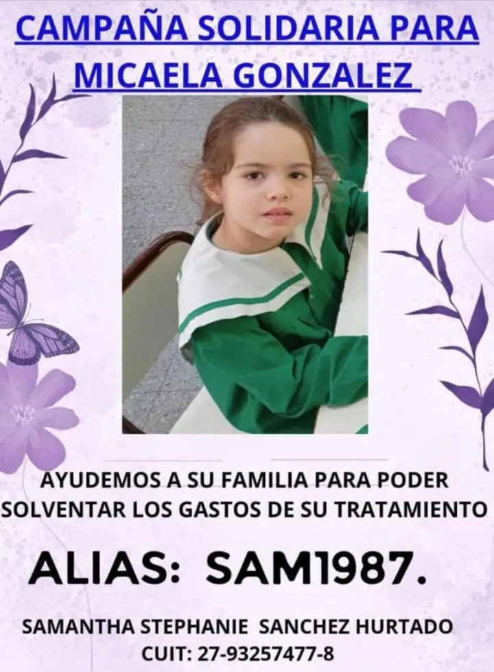 Los que quieran colaborar con Micaela pueden hacerlo a través de Mercado Pago o transferencia al Alias: SAM1987. O al CUIT 27-93257477-8 a nombre de Samantha Stefhanie Sánchez Hurtado.