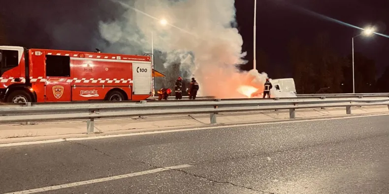 Una camioneta, tipo utilitario, de color blanco arde en llamas frente a la mirada atónita de los conductores, en Capital.