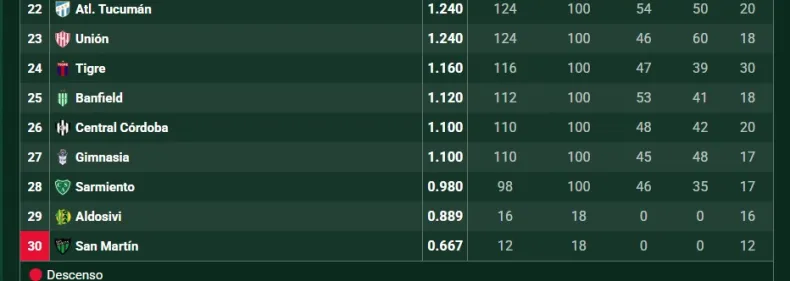 En la tabla de promedios el equipo de Romagnoli suma 0.667 y está último. Por encima están 0.889, Sarmiento 0.980, Gimnasia 1,100