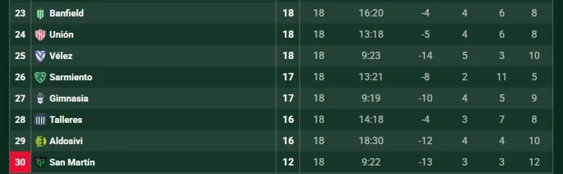 En la tabla anual también cierra San Martín pero comparando los puntos del resto no estan lejos ademas de Aldosivi y Tallleres (16), Gimnasia y Sarmiento tienen 17 contra los 12 del Verdinegro.