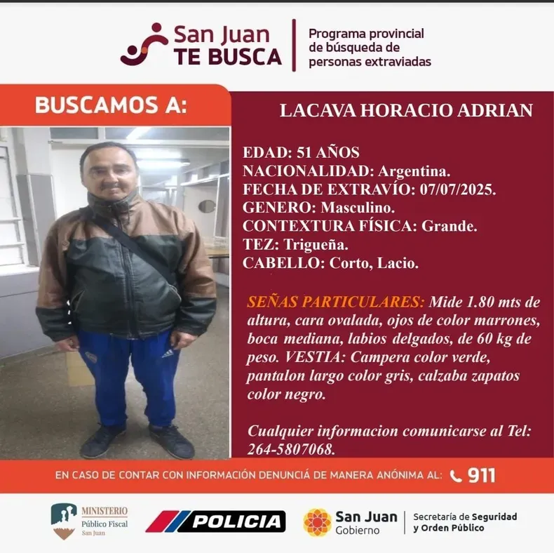 La Secretaría de Seguridad y el Ministerio Público Fiscal de San Juan implementaron nuevamente el programa "San Juan te Busca", como consecuencia de una denuncia por la desaparición de Horacio Adrián Lacava, un hombre de 51 años que salió de su casa el pasado 7 de julio y hasta el momento han podido dar con su paradero y ya lleva más de 15 días.