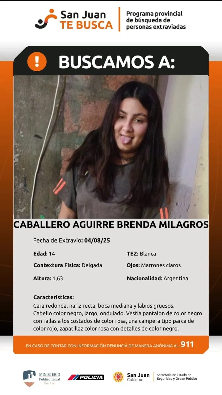 Tras conocerse, la denuncia por la desaparición de personas, automáticamente se activó el programa "San Juan te Busca" y junto a varias secciones de la Policía de San Juan, se montó un operativo de rastrillaje por diferentes puntos de la provincia, para dar con el paradero de la menor Brenda Milagros Caballeros Aguirre, de 14 años, que salió de su casa no regresó.