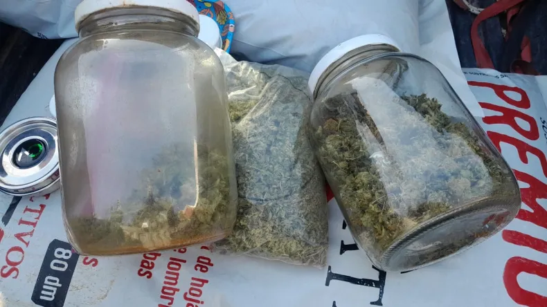 Los ciudadanos Moreno Miras Lucas (33 años) y Castro Canitrot Catalina Daniela (31 años) exhibieron dos frascos de vidrio de 3 litros con flores de marihuana y una bolsa tipo ziploc con la misma sustancia. Las pruebas de campo arrojaron un total de 178 gramos de Cannabis Sativa.