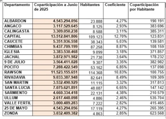 En departamentos alejados con baja población, una coparticipación per cápita alta actúa como mecanismo de compensación territorial, permitiendo cierta equidad para lugares con poca capacidad de recaudación propia. Sin embargo, en el Gran San Juan, el panorama es distinto: departamentos populosos como Capital y Rawson (ambos con más de 100.000 habitantes) reciben menos dinero por persona que otras zonas cercanas como Pocito o Santa Lucía, que tienen menor densidad poblacional pero una distribución más favorable por habitante.