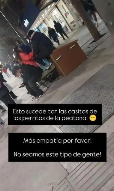 Una imagen viral desató la furia de los defensores de los animales al mostrar a personas sentadas sobre las casitas para perros callejeros en la peatonal de San Juan.