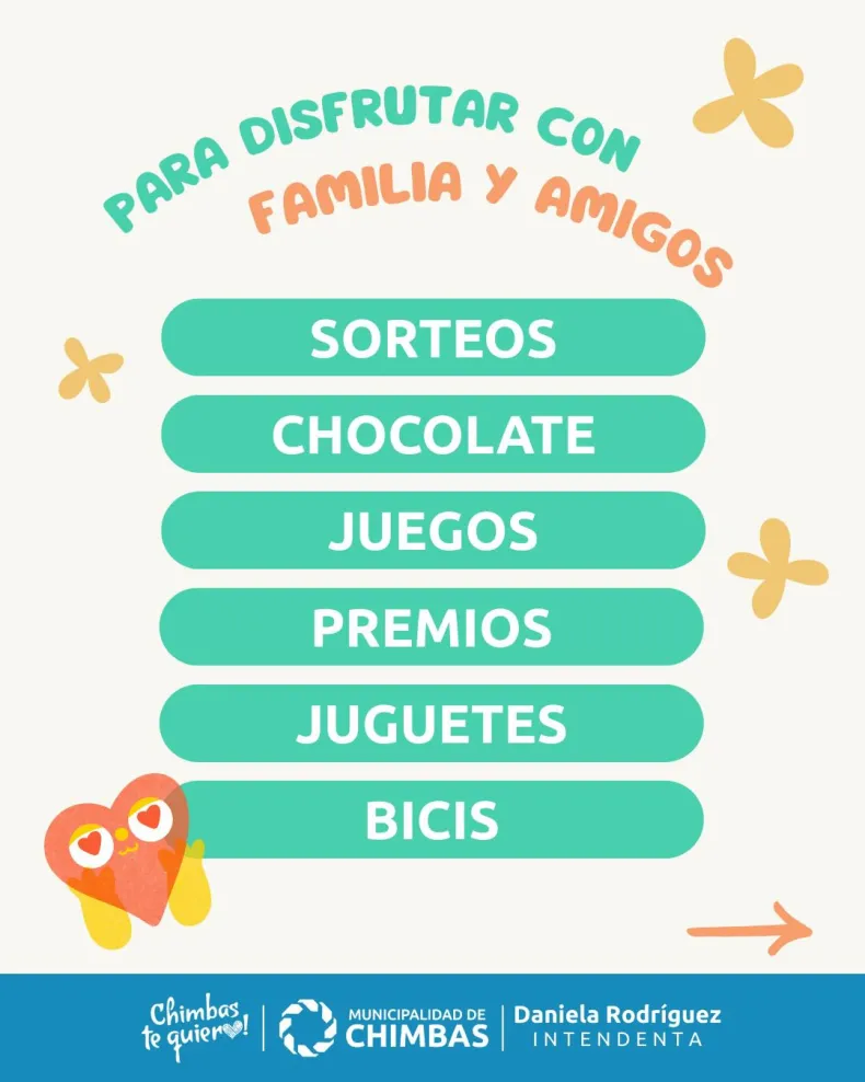 La entrada es libre y gratuita, donde los chimberos y chimberas podrán disfrutar de un espectáculo pensado tanto para los chicos y la familia, con juegos de kermes, didácticos, actividades deportivas, shows sobre escenarios y un exquisito chocolate para todos.