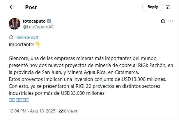 El ministro de Economía, Luis "Toto" Caputo, anunció a través de la red social X que Glencore, una de las compañías mineras más importantes del mundo, presentó formalmente dos proyectos para acceder al Régimen de Incentivo a las Grandes Inversiones (RIGI). Se trata de Pachón, en el departamento Calingasta de la provincia de San Juan, y de Minera Agua Rica, en Catamarca.