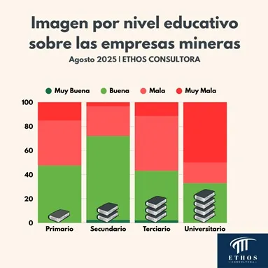 El nivel educativo también marca diferencias. Quienes tienen estudios primarios o secundarios tienden a valorar más a la minería (47% y 69% de imagen buena, respectivamente), mientras que entre los universitarios predomina la visión negativa, con un 50% de opiniones "muy malas".