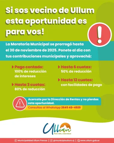 La Municipalidad de Ullum anunció la prórroga del régimen de moratoria fiscal que permitirá a vecinos y comerciantes regularizar sus deudas tributarias vencidas. La medida, sancionada por el Honorable Concejo Deliberante, responde a la difícil situación económica que atraviesa el país, brindando una herramienta para los contribuyentes mediante planes de pago accesibles. Esto a su vez permitirá mejorar la recaudación y la prestación de servicios públicos.