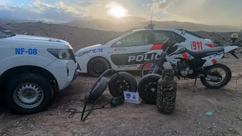 Los móviles del Comando Radioeléctrico Oeste hallaron en aquel lugar 3 ruedas de automóvil, 1 garrafa de 15kg y 1 bomba de agua.