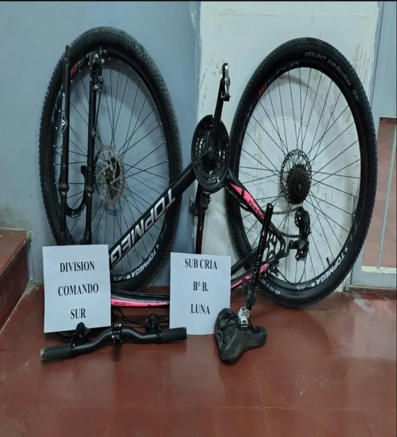 Allí, los delincuentes, se apoderaron de la bicicleta marca Mungstan "Top Mega" rodado 29, color negro con letras rosado y gris, la que fue encontrada desarmada en inmediaciones del lote 32, del departamento Pocito, cuando personal policial de la Sub Comisaría Buenaventura Luna, del departamento Rawson, se movilizaban por la zona.