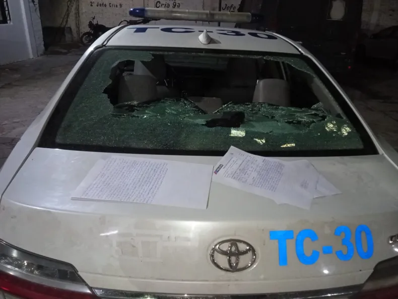 Durante la persecución, un móvil policial sufrió daños en la luneta trasera después de que los sospechosos arrojaran una piedra.