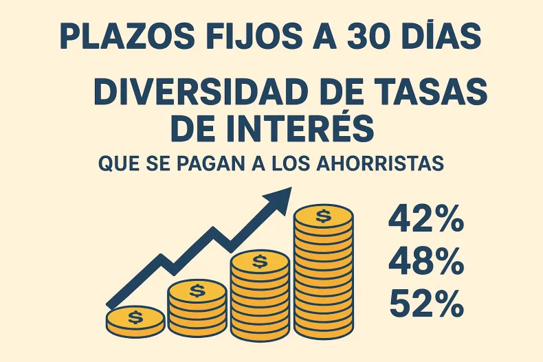 Dispersión de tasas: actualmente, los rendimientos anuales ofrecidos por los bancos para plazos fijos a 30 días varían entre 38% y 53,5%, según la entidad y su situación de liquidez.